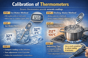 In everyday terms, calibration means checking your thermometer against a known temperature reference — an ice bath (0°C), boiling water (adjusting for altitude and atmospheric pressure), or a certified reference thermometer — and adjusting the reading accordingly.